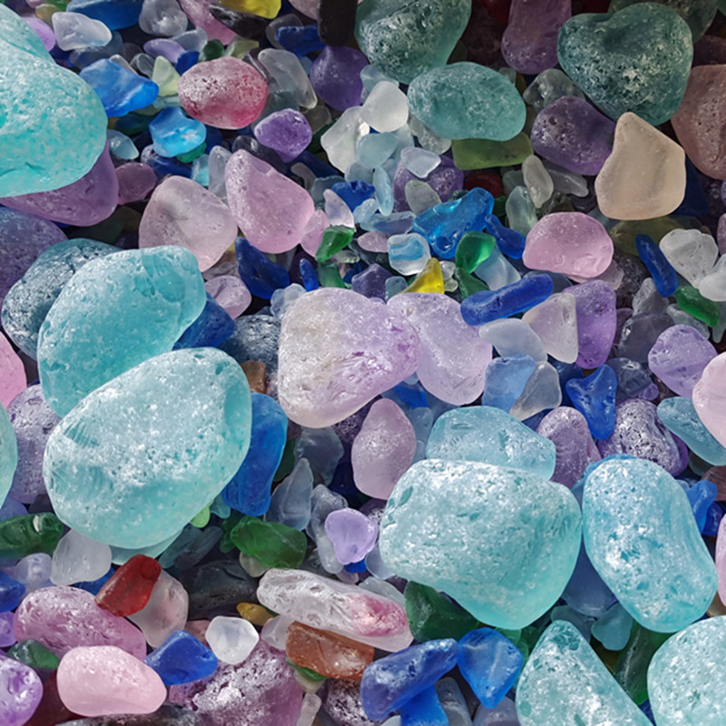 海玻璃是在海灘或大型湖泊邊發(fā)現(xiàn)的碎玻璃殘骸,它們經(jīng)過(guò)水流和砂石的打磨,表面鋒利的棱角被磨平,變得非常光滑。海玻璃源于扔進(jìn)水中的玻璃瓶子或生活垃圾中的玻璃,主要有綠色、透明、棕色以及琥珀色,也有少數(shù)淡藍(lán)色、黃色和粉色的。